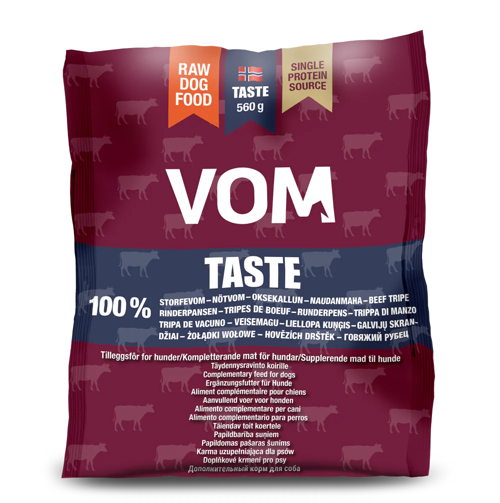 VOM TASTE est une série de produits de nourriture pour chiens composée d’une seule espèce animale ou d’un seul type d’abats. Ce sont des produits très adaptés comme aliment complémentaire, comme nourriture sèche ou comme ingrédient dans une viande crue que vous avez préparée vous-même. Ici, il est important de mélanger selon vos propres souhaits et besoins. Toutes les variétés peuvent également être nourries temporairement comme aliments complets, par exemple dans le cas d’un régime d’élimination dans le cadre d’un diagnostic d’allergie. Pour l’instant, nous proposons : 100 % poulet, 100 % agneau, 100 % bœuf, 100 % tripes de bœuf. Des prémix vitaminiques et minéraux sont ajoutés à tous les produits de la série Taste. Les produits qui ne contiennent pas naturellement d’os contiennent un peu de calcium supplémentaire.
